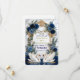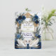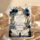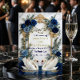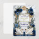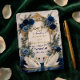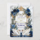 Sätt tonen för en sagolik fest med denna sofistikerade brevpappersserie. Perfekt för att tillkännage ett formellt kungligt blått bröllop med elegant romantik. Denna design har ett par eleganta vita svanar som är vända mot varandra och skapar en mjuk hjärtform över en reflekterande vatteneffekt. Scenen är inramad av en utsmyckad, falsk guldpräglad barockkam med frodiga akvarellblommor. Det botaniska arrangemanget visar djupa marinblå och kungligt blå rosor, accentuerade med dammiga blå blommor och mjuka, gröna eukalyptusblad. Bakgrunden simulerar en mjuk grå marmorstensstruktur för en lyxig finish. Typografin kombinerar ett flödande, handskrivet kalligrafiskript med en
