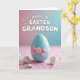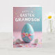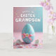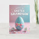 Designen har en jämn turkos äggform centrerad framtill och är översållad med små gyllene och mjukt rosa prickar som fångar ljuset som konfetti. Ett rosa band löper runt mitten av ägget, knutet prydligt och avslutat med en vit tusensköns-liknande blomma med soligt gul mitt, vilket ger scenen en mjuk, tillgiven känsla 🌷. Bakom det, tonar bakgrunden från pastellrosa i botten till ljust blått närmare toppen, vilket ger en mjuk, luftig stämning. Fördelade cirklar i rosa, orange, blått och gult flyter över ytan och suddas ut i fjärran, som en feststund infångad mitt i skrattet 🐰. Nära toppen, står vit versal text “HAPPY 1st EASTER GRANDSON”, centrerad och lätt att upptäcka mot den blå-rosa färgtoningen. Nedanför ägget, vilar små vita äggskal
