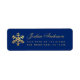 En elegant blå och guld returadressetikett, rekommenderad för vinterfirandets gratulationskort. Den har en falsk guld folie snöflinga till vänster och gyllene text till höger. Namnet är skrivet med elegant kalligrafi, adressen i mindre versaler. Den kan användas för ett jul- eller nyårsgratulationskort. Bakgrunden är royalblå.
