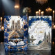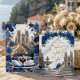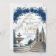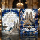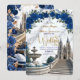 Sätt tonen för en majestätisk fest. Denna design har en romantisk katedralvy med kungliga blå blommor och förgyllda accenter, perfekt för sago-unioner.
