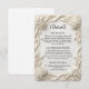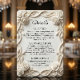 Förhöj din formella tillställning med denna sofistikerade design med ett tryckt 3D-skulpturellt estetiskt uttryck. Perfekt för boendeinformation, vägbeskrivningar eller detaljer om mottagningen. Denna design visar en mästare trompe l'oeil-teknik som simulerar utseendet av handskuren gips eller arkitektonisk sten. Den symmetriska ramen har intrikata rosor, frodig lövverk och sammanflätade band i mjuka elfenbens- och cremefärger för att skapa en realistisk skuggeffekt och djupverkan. Typografin skapar en slående kontrast i djupt kolsvart, och kombinerar ett traditionellt serif-teckensnitt för brödtext med ett svepande kalligrafiskt manus för rubriker. Detta är en platt tryckt bild med en Faux