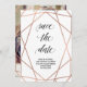 Detta eleganta spara-datum-kort har ett falskt rosa guldgeometriskt mönster på en vit bakgrund, med modern typografi. Baksidan innehåller ditt foto överlagt med samma geometriska mönster.