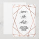 Detta eleganta spara-datum-kort har ett falskt roséguld geometriskt mönster på en vit bakgrund, med modern typografi.