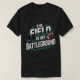 Den svarta t-tröjan innehåller texten "FÄLT ÄR MY BATTLEGROUND" i ett fet, stiliserat vitt teckensnitt med grönt och ett något plågat struktur. Integrerad i designen är grafik från en fotboll och en klyvbar idrottssko, vilket tyder på en fokusering på amerikansk fotboll. Den övergripande utformningen ger en känsla av intensiv konkurrens och engagemang för idrotten.