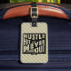 Texten lyder: Hustle, Slå och Sluta aldrig, med en korsad fält-hockeyklubba. märkre av anpassade bagage/väska med fram- och baksida. Ändra bara texten med hjälp av textrutorna i avsnittet "PERSONALISERA IT" till högerna på designen. Om du vill växla mellan bagagemärkets framsida och baksida användor du de små ikonerna under huvudbilden.