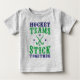 Bid-textdesign i grönt och lila, med texten: Hockey Teams Stick tillsammans, med korsad fält hockey sticks-grafik.