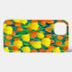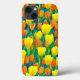 Telefonfodral i mönster av orange- och gult-tulpaner och grönt-löv i fält, accentuerat med svart bakgrund