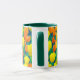 Mugg i ett mönster av tulpaner för orange och gult och löv för grönt i fält