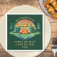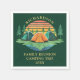 Skapa pappra blöjor för personlig för en familjeåterförening party som anordnas på ett campingtema. Utformningen illustrerar vintagens solnedgång med tält i en träd-skog i gräs nära sjö på grund av grönten. Med mallen kan du enkelt anpassa texten med ditt efternamn och år.