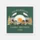 Skapa unika familjeåterföreningsservetter för ditt outdoorsy temaparty. Utformningen har ett solnedgångslandskap med bergsområden och gräs träd och sjö på en frammarsch grönt. Skriv din familj namn och år via mallen för att anpassa blöjor.