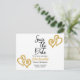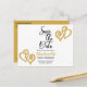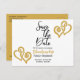Utformningen av familjeåterföreningsmeddelandet "Spara datum" (Spara datum) innehåller mörk guld som beskriver de länkade guld hjärtan på två hörn. Information om meddelandemallen springa mellan hjärtan. Kortet bak färg överensstämmer med framsidan. Anpassa mallinformationen på framsidan och baksidan, ta bort text och/eller klicka på anpassa för att välja det typsnitt färg, storlekt och stil som du föredrar.