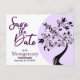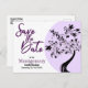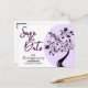 Den här familjeåterföreningen "Save the Date"-meddelandedesignen har en modern svart och lila träd med sträng ljus. Fyll i fält i mallen för personlig information, ta bort text och/eller klicka på anpassa för att välja ett typsnitt färg, storlekare och stil som du vill använda.