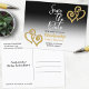 Den "Spara Datum"-designen för familjeåterträffsmeddelande har länkade gyllene hjärtan i två hörn. Mallinformationen för meddelandet löper mellan hjärtana. Färgkombinationen på baksidan av kortet matchar framsidan. Anpassa mallinformationen på fram- och baksidan, ta bort text och/eller klicka på anpassa för att välja en typsnittsfärg, storlek och stil som du föredrar.