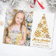 Ett chic guld-manuskort med ett familjefoto bredvid ett vackert träd tillverkat av guldsnöflingor ovanför God jul och Gott nytt år. Anpassa med ett andra foto på baksidan av det här trendiget snöflingkort för helgdag.