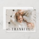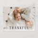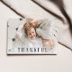 Fira tacksamhet med stil med detta moderna fotokort för Thanksgiving, med ett stort personligt familjefoto och det eleganta ordet TACKSAM tvärs över designen. Perfekt för att skicka högtidliga hälsningar, dela din favoritfamiljemoment eller uttrycka hjärtlig tacksamhet till nära och kära. Detta anpassningsbara kort låter dig lägga till ditt familjenamn, år och meddelande för en verkligt personlig touch. Ett varmt och tidlöst sätt att sprida glädje och tacksamhet denna säsong.