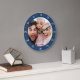 Skapa en speciell av en typ runt eller fyrkantig väggklocka. Personligens klockdesign har ett enkelt modernt typsnitt överlagt på ditt fullt-utfallsfamiljfoto. En anpassningsbar-klocka är en unik julklapp för morföräldrar, nya föräldrar eller en roligt hemmavärmare för nyfödda som dekorerar sitt första hem tillsammans.