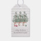 Märkre med julklapp i helgdag som har en vattenfärgad jul i gräs träd, på träbakgrund, och namn i familjen på en lätt träbakgrund. Se fullt samling av matchande delart för den här designen på: https://www.zazzle.com/collections/rustic_pine_trees_christmas-119221021302253069