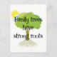 I det här vykortet ingår en teckning i träd med sol och ett moln och texten "Familj Träd har starka rötter.".