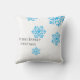 Lägg din egen familj namn till en vacker julkudde. Modern glitterblå fallande snöflingor på en skarp vit bakgrund är en originalgrafik. Smörfärgad elegant svart text kan ändras på vilket sätt som helst.