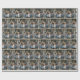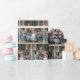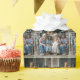 A group of dogs is dressed in human clothing, sitting together on a porch in a family portrait style