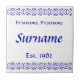 Viktorianska stil-familjens namn-bricka - blått på vitt med skrivarens gräns