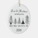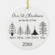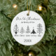 A personalized Ceramic Ornament to commemorate the year you became a Family of 5! "Our first Christmas as a family of five" beautifully illustrated with modern black and white line drawings of five elegant Christmas trees. Each tree can be personalized with a family member’s name, and the year appears at the bottom. A perfect keepsake for new parents, growing families, grandparents keepsakes, or friends celebrating a first Christmas with a newborn together. Adds a contemporary, minimalist touch to any tree and creates a lasting memory for years to come.