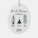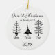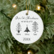 Celebrate your first Christmas as a family of three with this elegant modern Scandinavian ornament. Featuring three minimalist black-and-white Christmas tree line drawings, each tree with a family member’s name, and the year appears at the bottom. This round ceramic ornament is a stylish and timeless keepsake, perfect for new parents, grandparents, or friends with a new baby gifting a thoughtful holiday decoration. Ideal for contemporary holiday decor lovers and modern homes.