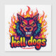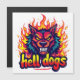 "Den här kraftfulla och edgy designen har en hotfull, varg-liknande varelse med vassa tänder och glödande gult ögon, uppslukad av pulserande flammor. Texten "helvetets hundar" visas på en framträdande plats under varelsen i ett fet, stiliserat teckensnitt. Denna utformning förmedlar en känsla av aggression, makt och en eländig anda. Det är mångsidigt för en rad produkter som syftar till ett djärvt, rebellöst eller högenergiskt estetiskt. Föreställ dig det på kläder, tillbehör, poster eller varumärke för idrottslag eller edgy varor."