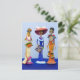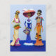 Färggrant vykort med tre catrinas mot en blå bakgrund.