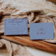 Ett enkelt och elegant kalligrafi bröllop RSVP-kort. Som har en blå bakgrund och djup röd burgunder handritad ram och info.