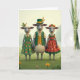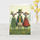 Det här kortet visar tre uppklädda får som står tätt ihop i en solbelyst grön äng, med kropparna vända framåt som om de stannat upp för en vänlig porträttbild 💚. I mitten står en stolt bagge i en skoggrön väst med blanka guldbuketter över en krämfärgad skjorta, med en mörk hatt prydd med ett gult band och några vetestjälkar. Till vänster om honom lutar sig ett tackfår i en smaragdgrön klänning täckt med små orange- och gula tusenskönor, med en vit krage som ger en mjuk och tillgiven touch. Till höger om honom bär ett annat tackfår en terrakotta-röd klänning med ett mönster av vita och gula blomsterprydnader, och en röd mössa som är prydd med en ljusgul blomma, som om hon klätt sig för att imponera på någon speciell. Deras stora, uttrycksfulla ögon möter betraktaren direkt, och sättet som de två tackfåren flankerar baggen på antyder en otvungen närhet, som om de är vänner som poserar med