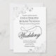This beautiful wedding invitation features an elegant silver and white design with ornate faux foil curls and swirls in the corners. The word "wedding" is written in fancy script lettering with an elaborate flourish on the end of the word. Simple, stylish, posh, and glam, this invitation is sure to make a lasting impression, and is a wonderful way to invite your family and friends to share in your joy on your special day.