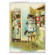 Vintagekonstverk av morkatten som lite fångar henne kattunge upp på en pall som snitching en smak av godbitarna i en burk.