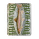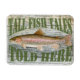 En dekorativ magnet för fiskaren i ditt liv. "Tall fish tales here" med en detaljerad bild av en regnbåge på en rustiskt vävt träbakgrund.