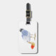 Fånig fiskmås målar upp bagagetaggen. Han är upptagen med att äta sina frites.