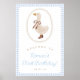 Välkomna gäster till firande med den här festliga och charmerande födelsedagsvälkomstskylten. Den här designen har en vit gås som är klädd i stövlar mot en mjuk blå gingham-bakgrund och ger en aning roligt och elegans till vilken födelsedagsfest som helst.