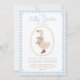 Sötblått gingham-babyduschinbjudan med en gås i stövlar.