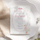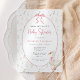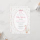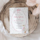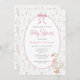 Den här elegant babyduschinbjudan blandar vintagens charm med mjuka blommigtar och en lekfull gåva i en rosa båge. Perfekt för ett firande i flicka, de handmålade guldblommorna och den klassiska designen ger en varm, tidlös känsla för din speciella dag.