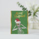 Detta vykort har ett fånig som skrattar åt skelettet och håller julprydnader i guld och silver i öga upp till socketerna och bär en röd Jultomten hatt på gröntens bakgrund med faux lilla glitter i guld och glansig glitter i guld med gräns.