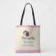 En skuldersäck med ett lustigt ordspråk - Arbeta tills glass. En rosa diagonal rand mönster längs överkanten och grund gräns. Illustrerad med en yummy Chockglass pub, en 3-scoop-sundae med chokladtopp, sprinkles och lite körsbär på toppen. Och jordgubben flyter med vispgrädde.