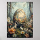 Underbara Påsk Poster med ett stort påskägg och söta djur som en påskhare eller kanin. Magic Fantasy Forest Blommigt Art med blommor och ätliga djur.