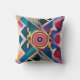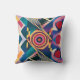 En livfull och fängslande bild som visar en fantastisk modern geometrisk mönster kuddvar. Mönstret består av olika former i djärva, kontrasterande färger, inklusive trianglar, fyrkanter och cirkulära former. Designen är symmetrisk men ändå dynamisk, med en känsla av flytande rörelse.