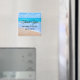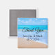 En bröllop tack magnet med ett fotografi av en klar blå havsscen med mjuka vågor längs en strand och mjuk brun sand. En blå himmel med fluffiga moln i fjärran. Lugn tropisk idyllisk havsutsikt.