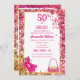 Modern och elegant, för inbjudan till 50-årsfest för en fashionista. Kvinnors glamourösa lyxiga falska glitteriga varma rosa konfettiram, vackert par högklackade skor 👠 med slingor sitter i det vänstra hörnet och en söt och färgrik gyllene rosa handväska 👛 sitter i det nedre högra hörnet, 50 & Fabulous text varmt rosa fuchsia på vit bakgrund. Du kan enkelt ändra ditt namn och adress, typsnitt, färg, storlek och ålder genom att klicka på Zazzles anpassningsalternativ.