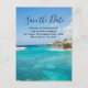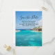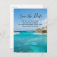 Spara datumet bröllop-vykortet med ett vackert foto med en tropisk strandort. Söt blå stranden vatten och vit sandstrand med överskötta hinnor ge det en stillastående övibe.