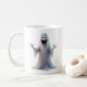 Mugg med ett vänligt, karikatyrskt spöktecken som sprider sig mycket med stort, uttrycksfullt ögon och utsträckt arm, ge en lekfull vibe.
