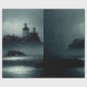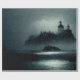 Black and White Fantasy Island med gammalt fyr på Misty Foggy Mörk Natt.