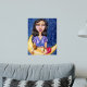 Denna konstaffisch har en fantasibild av en söt mörkhårig dam i en lila nattlinne som håller en sovande gul halvmåne med ansikte och rosa läppar under en djupblå natthimmel med vita stjärnor.
