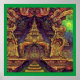 Detta är ett exempel på ett tempel med ett psykologiskt och surrealistiskt stil. Det är symmetriskt och har en pyramidliknande struktur med spetsig överkant. Den består av mönster och formgivning med en blandning av orange, rött och lila färg. Bakgrunden är en mörk lila himlar med grönt måne. Den allmänna stämningen i bilden är mystisk och på annat sätt global. Den här designen är perfekt för alla fläktar av fantasi, mysticism eller konst.