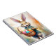 6.5 x 8.75 bärbar dator med en glad kanin i en blå apparat med en basket fylld med färgstarka, dekorerade ägg. Bakgrunden innehåller information om mjuk blommigt och varm färg.
